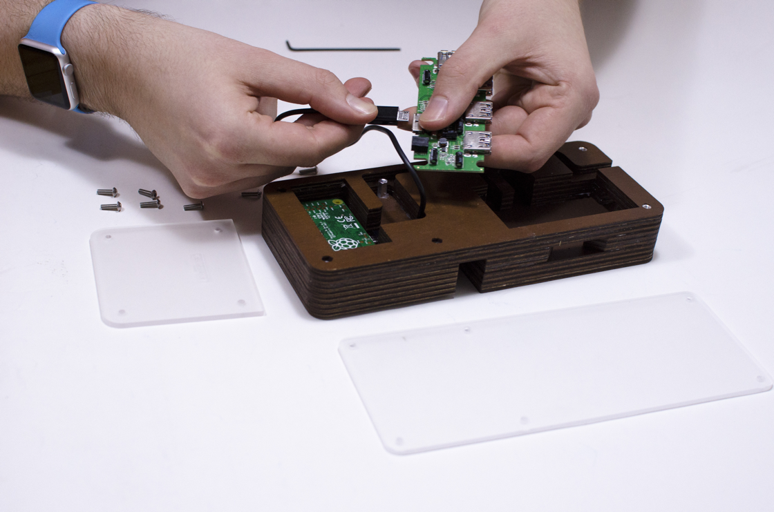 The assignment was to build a testable solution with off-the-shelve components. Which is why I used a Raspberry Pi Zero with a Scroll pHat LED grid, an USB hub, and a Dymo M10 postal scale to create this prototype. The whole unit is powered via the USB hub.